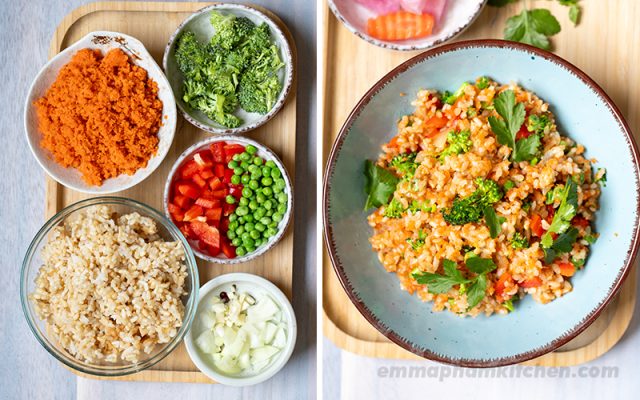 Món cơm rang rau củ bổ dưỡng đặc biệt tận dụng được bã cà rốt làm từ nước ép. Món ăn ngon miệng không mất thời gian vào bếp.