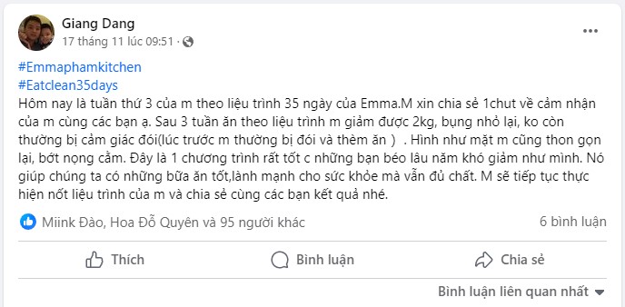 Hôm nay là tuần thứ 3 của m theo liệu trình 35 ngày của Emma. M xin chia sẻ 1chut về cảm nhận của m cùng các bạn ạ. Sau 3 tuần ăn theo liệu trình m giảm được 2kg, bụng nhỏ lại, ko còn thường bị cảm giác đói(lúc trước m thường bị đói và thèm ăn ). Hình như mặt m cũng thon gọn lại, bớt nọng cằm. Đây là 1 chương trình rất tốt c những bạn béo lâu năm khó giảm như mình. Nó giúp chúng ta có những bữa ăn tốt,lành mạnh cho sức khỏe mà vẫn đủ chất. M sẽ tiếp tục thực hiện nốt liệu trình của m và chia sẻ cùng các bạn kết quả nhé.