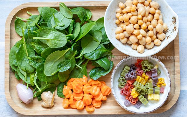 - Đổ nước hoặc nước hầm rau củ vào nồi sau đó cho hạt đậu gà, cà rốt vào đun sôi. Đun khoảng 10 phút sau đó cho hành, gừng, mì rau củ vào đun cùng. Đun đến khi mì chín cho rau cải vào đảo đều khoảng 2 - 3 phút nữa.