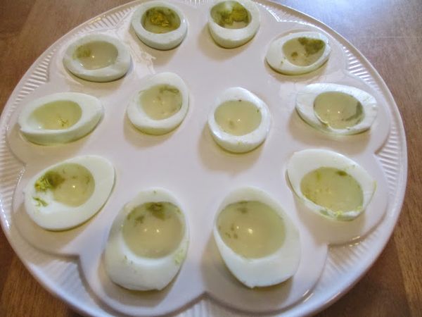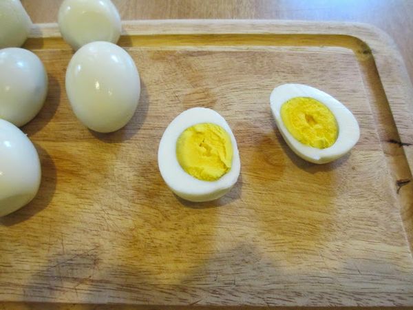 Trứng sau khi đã luộc chín, bóc vỏ và cắt làm đôi theo chiều dọc. Các bạn có thể dùng 1 chút bột ớt dùng trang trí thêm