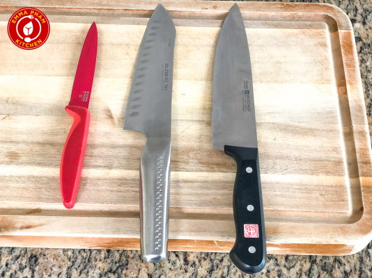 Trong hình có 3 con dao hiện tại Emma hay sử dụng, nhưng dùng nhiều nhất là em ở giữa Global. Em thứ 2 màu đỏ hay dùng thái hoa quả hay mang đi picnic rất tiện, rất sắc dao này sản xuất tại Thuỵ Sĩ.